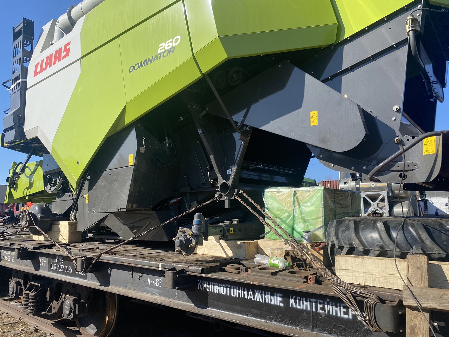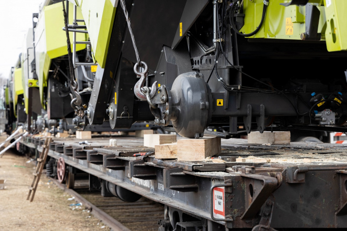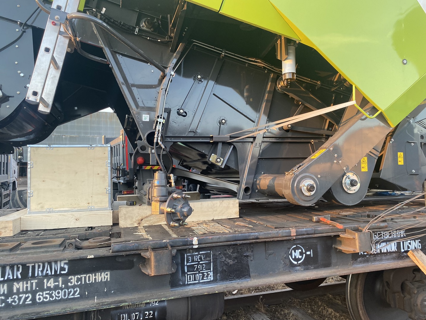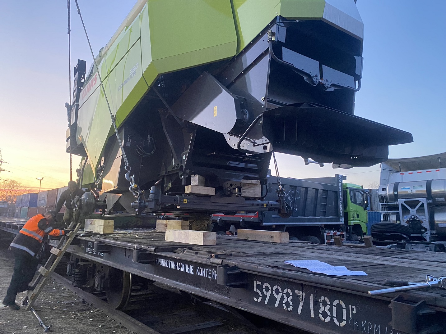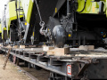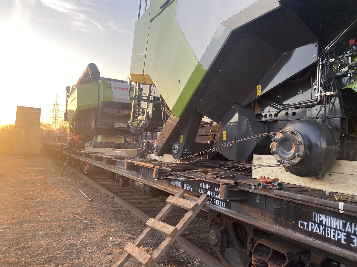 О подготовке комбайнов к погрузке: Поскольку маршрут Благовещенск–Тбилиси достаточно длинный (9090 км), мы привлекли на погрузочные работы специалистов CLAAS Россия. Они оценили качество залитого в моторы антифриза, чтобы замёрзшая жидкость не повредила систему охлаждения (ночная температура регулярно опускалась до -35°C). Частично разобрали комбайны, надёжно закрыли стёкла и детали кузова щитами OSB для транспортировки по правилам РЖД. В таком увязанном виде груз передали на станцию.