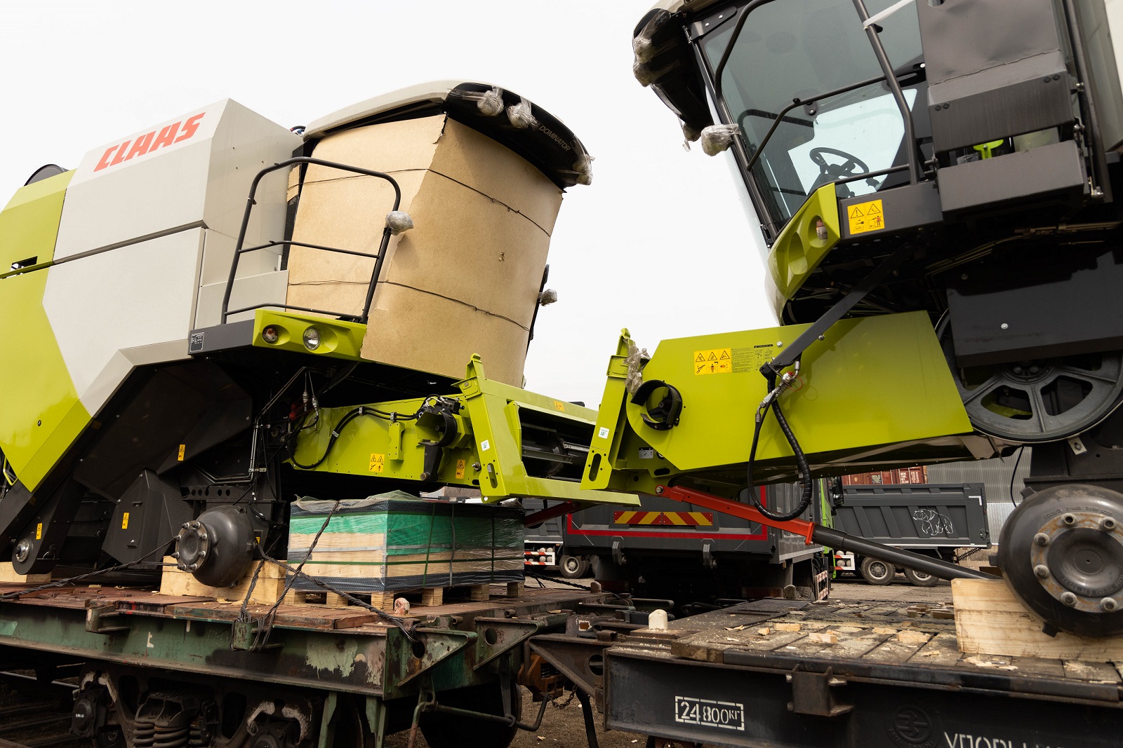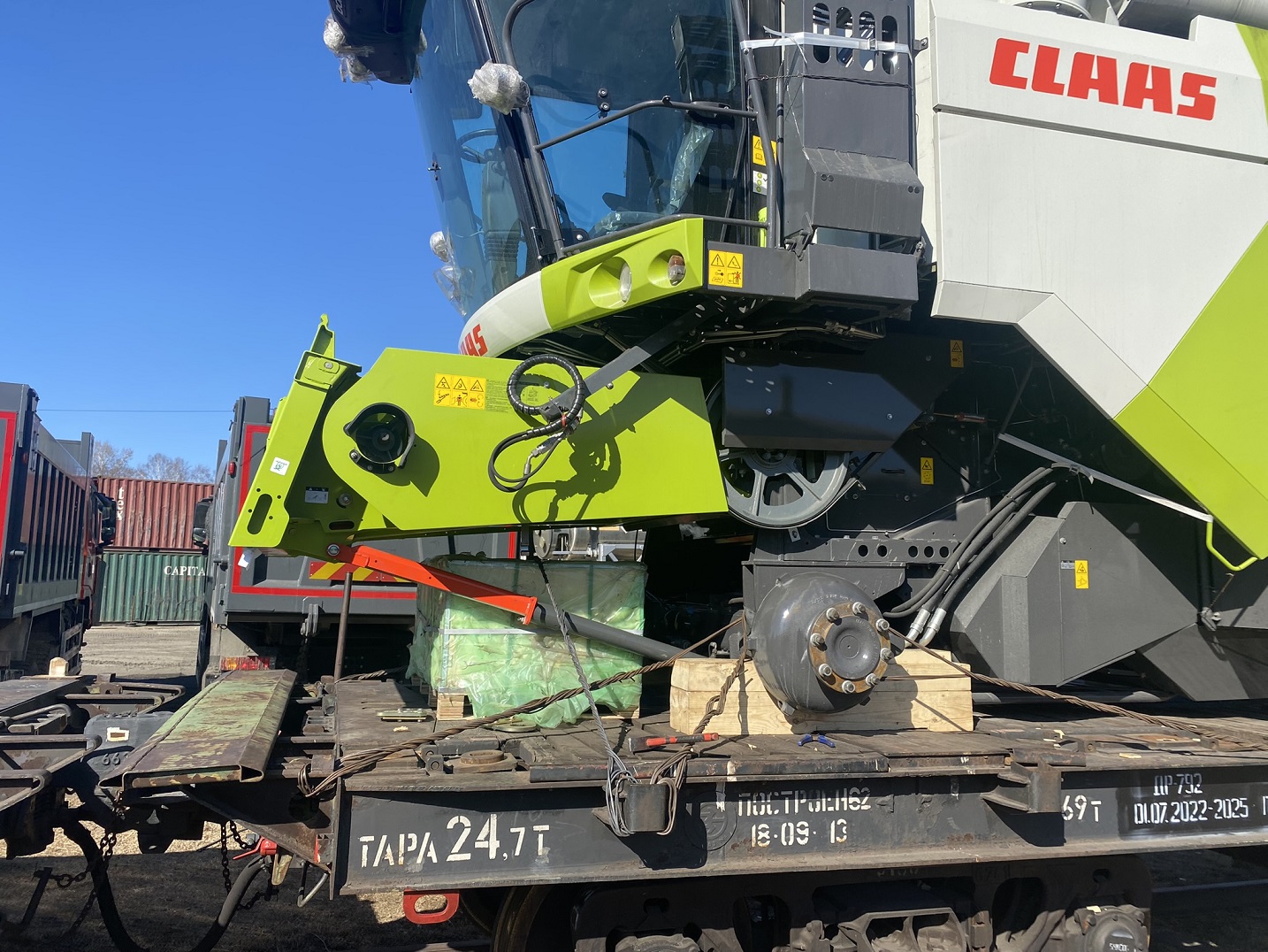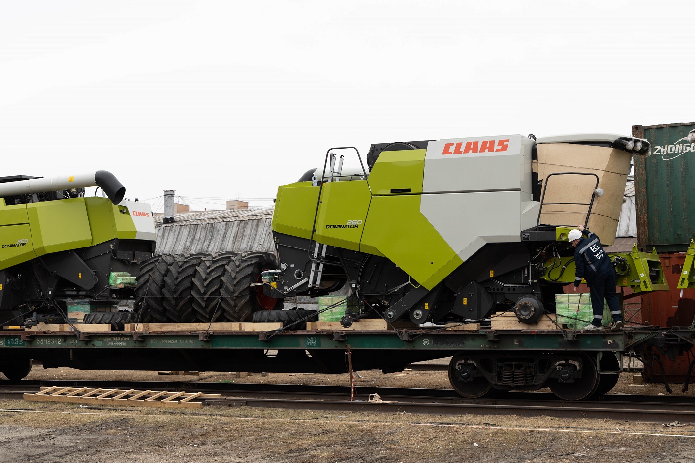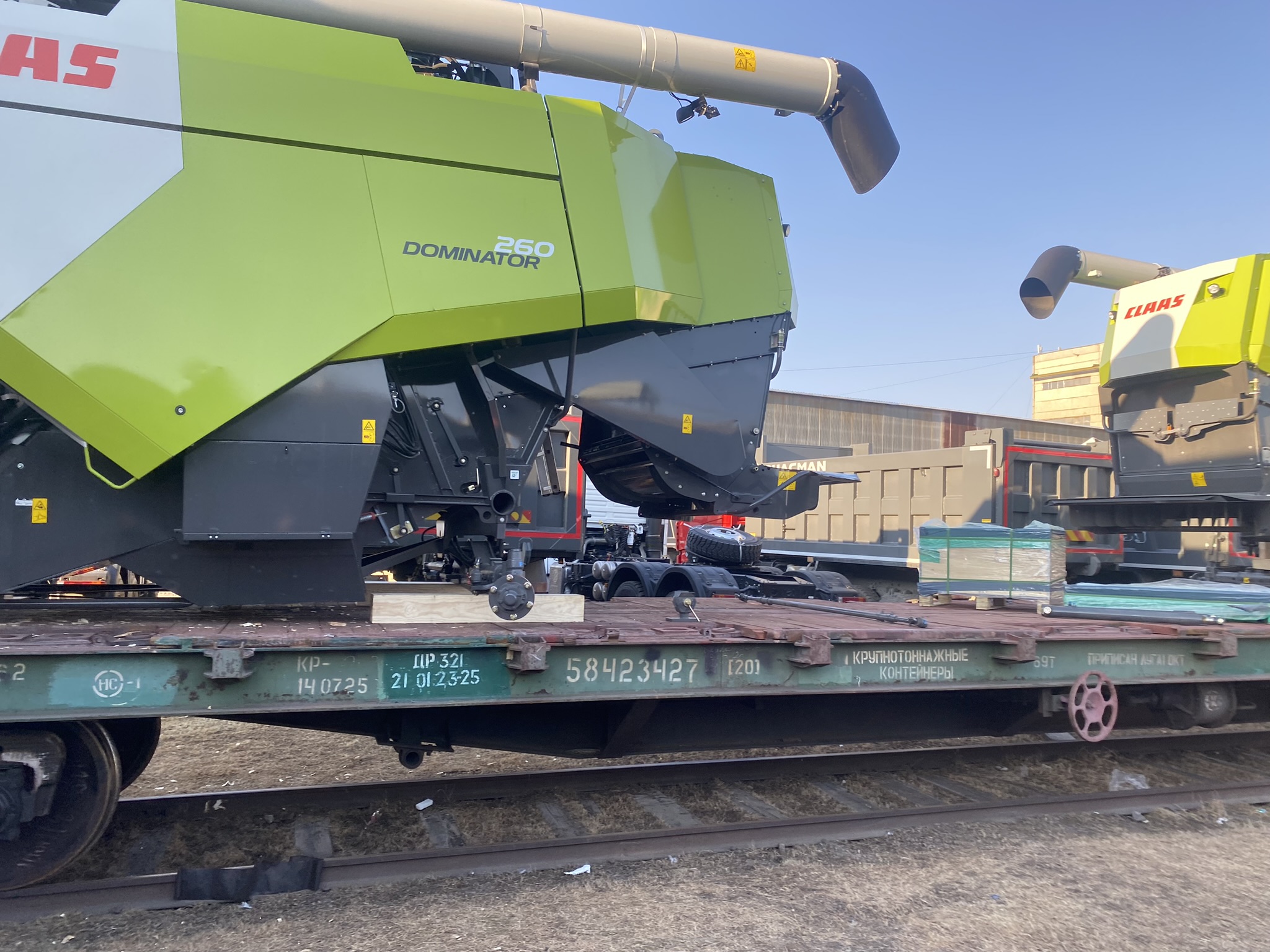 О подготовке комбайнов к погрузке: Поскольку маршрут Благовещенск–Тбилиси достаточно длинный (9090 км), мы привлекли на погрузочные работы специалистов CLAAS Россия. Они оценили качество залитого в моторы антифриза, чтобы замёрзшая жидкость не повредила систему охлаждения (ночная температура регулярно опускалась до -35°C). Частично разобрали комбайны, надёжно закрыли стёкла и детали кузова щитами OSB для транспортировки по правилам РЖД. В таком увязанном виде груз передали на станцию.