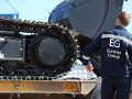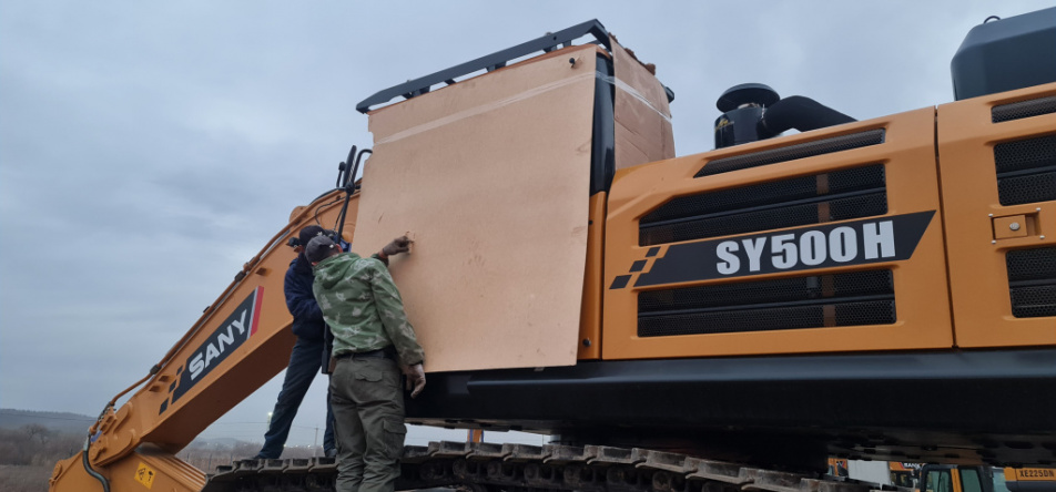 Наши механики приняли самосвалы и экскаваторы, проверили комплектность техники, подготовили ее к перевозке на пароме. Чтобы погрузить тяжелые (вес свыше 51 тонны) экскаваторы на паром, с них пришлось снять противовес, так как есть ограничения для прохождения прибывшей тяжелой техники (вес в снаряженном состоянии не должен превышать 48 тонн ). Для обеспечения сохранности остекления кабин, мы сделали комплекс по упаковке из однослойной фанеры.